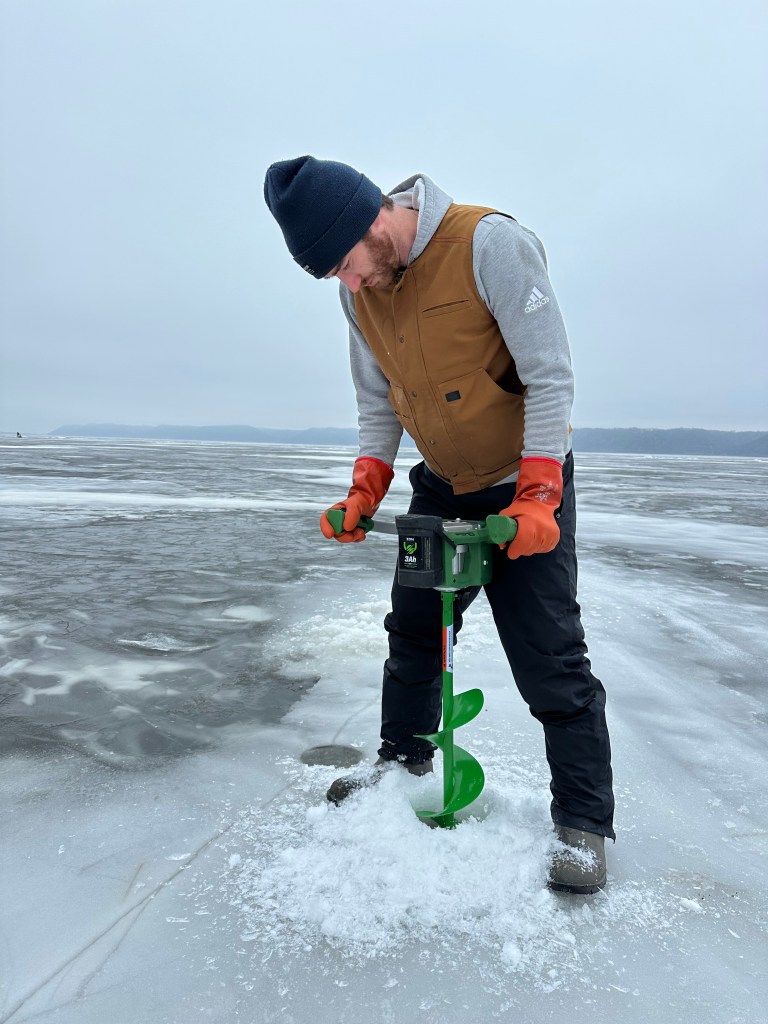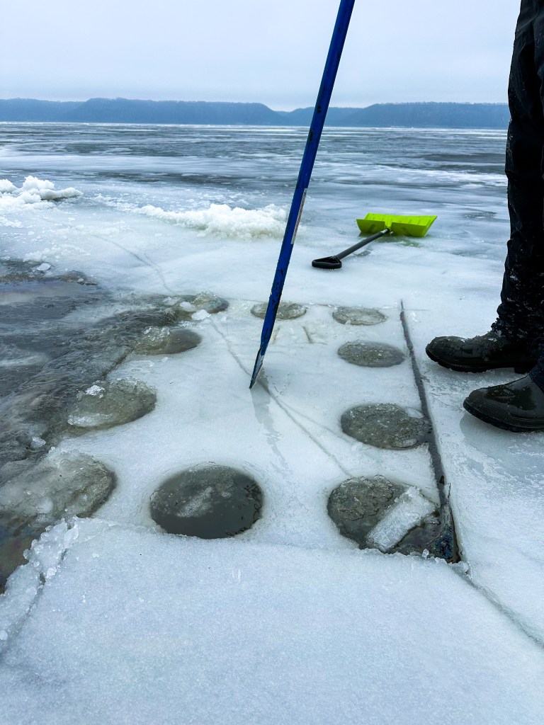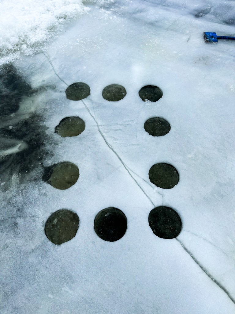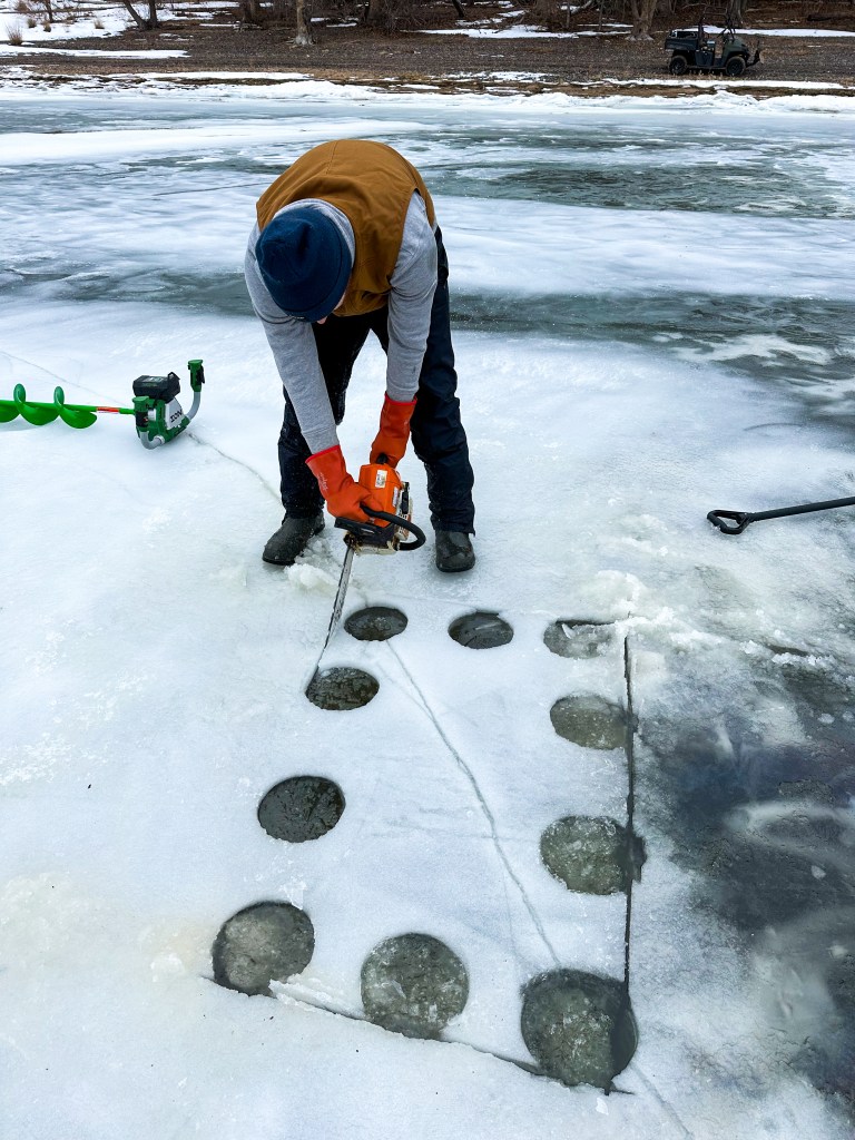 In the past we’ve only used a chainsaw, but pushing the block of ice under and away was a lot harder. This could be because the ice at the time was thicker, but we found that pre-drilling the hole outline with the ice auger made really quick work of the process. If you don’t have any mechanical tools, I’ve also seen the cutting done with an ice saw – which is more work but perhaps more authentic.