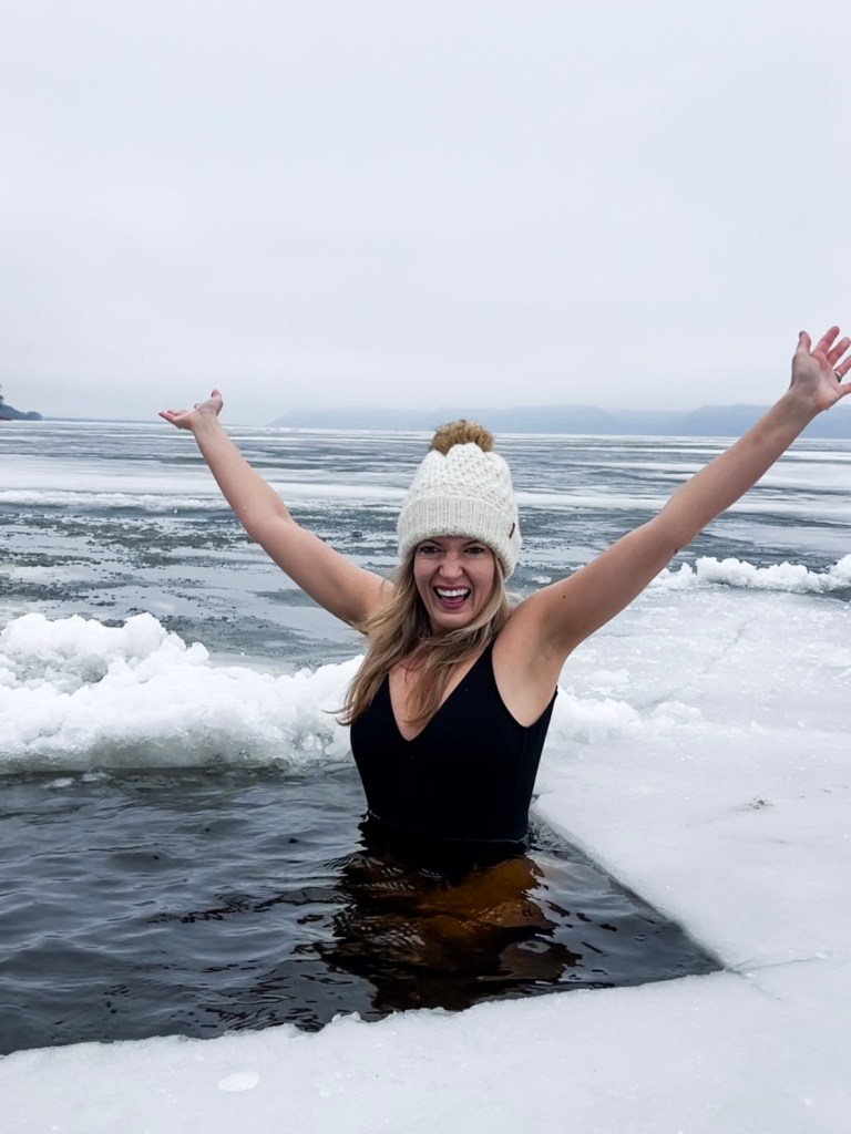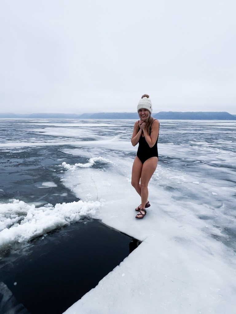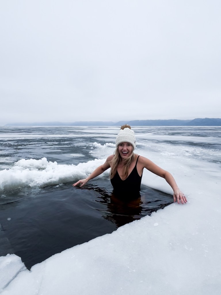 What to wear: I wear waterproof sandals to prevent my feet from sticking to the ice either before or after, and I like to wear one-piece swimsuits because for some reason that little extra fabric over my stomach makes me feel that little bit warmer. I have wool socks, sweatpants, and a sweatshirt at the ready for when I’m done and know that they’ll get a little bit damp from my suit.