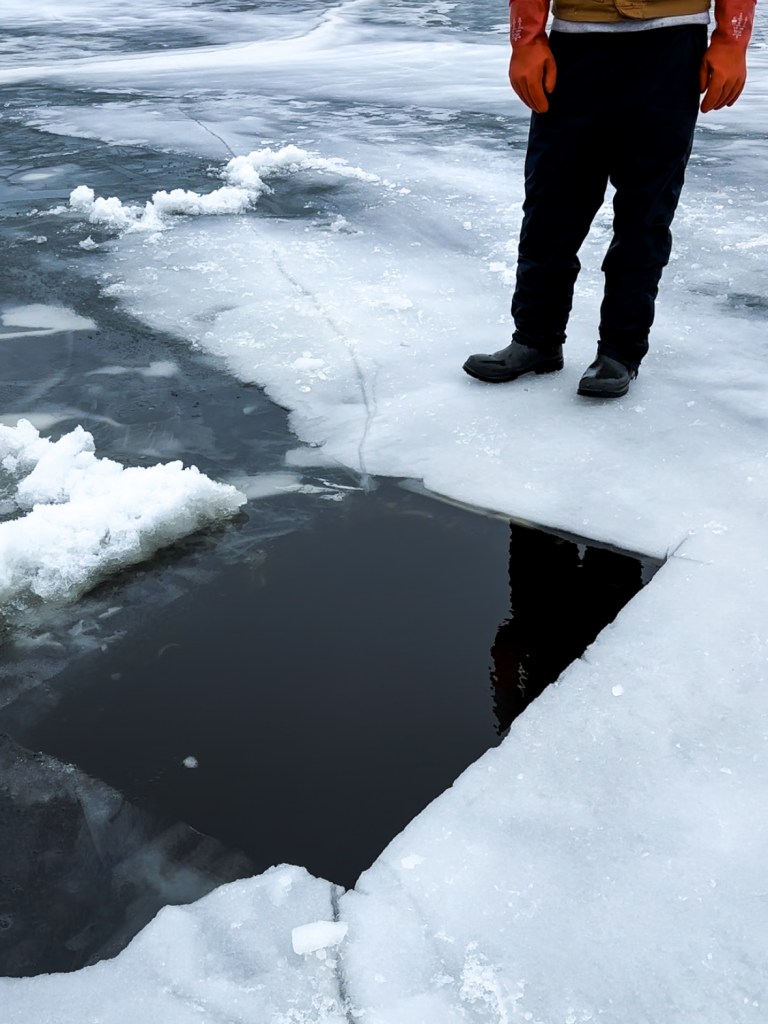 There’s preparation involved in taking an ice bath that includes finding and or/setting up your location. If you’re lucky enough to live on a lake that freezes over, then you have to cut a hole for your dip. Since I live at a summer camp, which is on a lake, we have lots of space to be able to do this – and the tools to do it as well. To expedite the ice hole cutting process, this year we used an electric auger to drill several holes in a rectangular outline. Then, my husband used a chainsaw to “connect the dots” in order to free the block of ice. Using an ice chopper, he pushed the entire block down and under the ice so that there was a completely clear space of very chilly water!