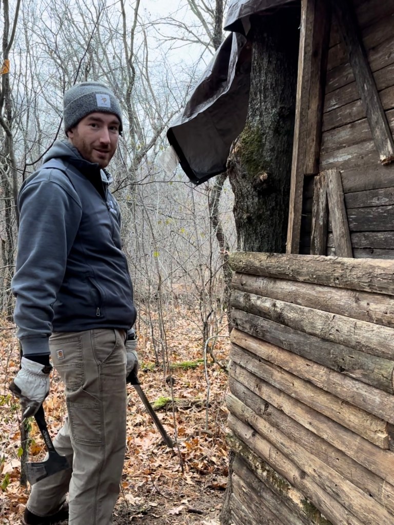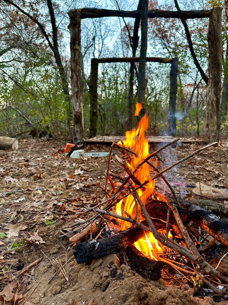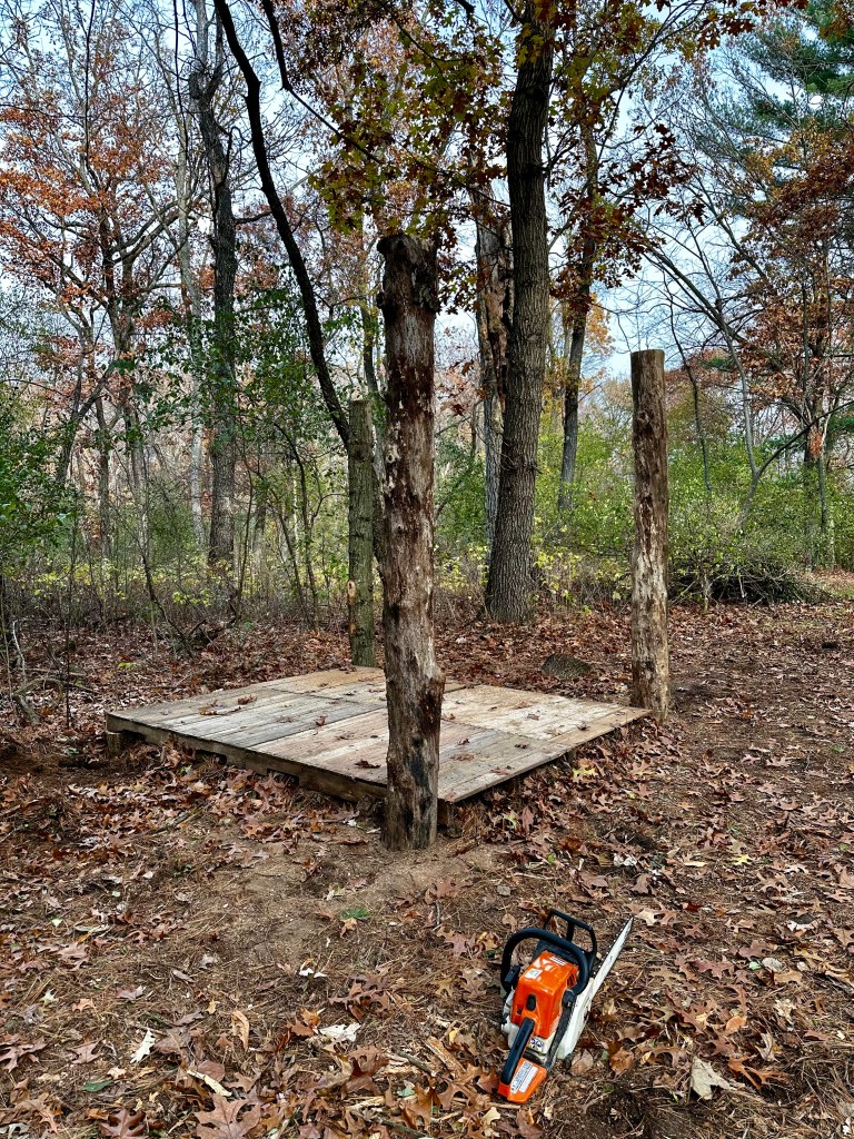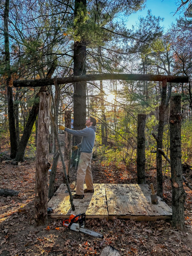First, Erik attached (nailed, screwed – my descriptions will be very generic!) four pallets together to make the floor. Then, we scouted out the best spot in the backwoods to build the cabin, and raked to level the ground and pulled up vines so that the area was clear. After positioning the flooring, we stuffed the underside of the pallets with leaves, dirt, and branches/sticks so it was sturdy and flat. Erik cut four straight logs of about the same width, and then used a post hole digger to make deep holes next to the corners of the floor. He hoisted the logs down and into the holes and we packed around them with dirt to make sure they were stable. Two more logs with Y shapes were positioned at the front and back center of the flooring, and Erik lifted the roof ridge log to sit between the two tree forks. He then placed an additional four logs horizontally across on top of the corner supports, and the outline of the tiny cabin was complete!