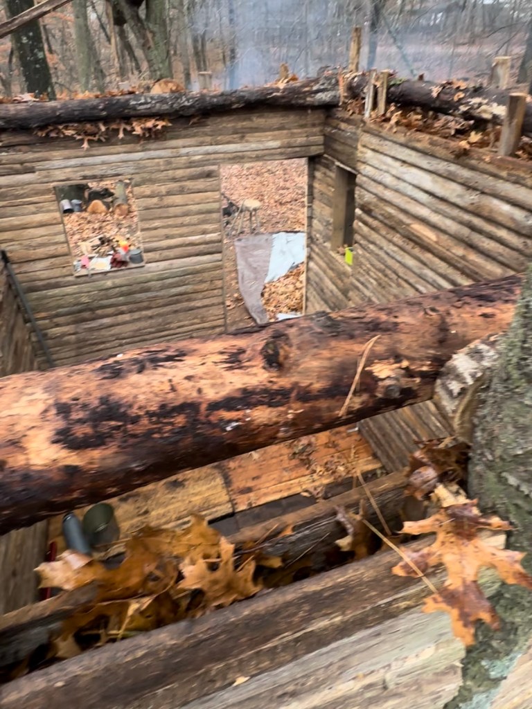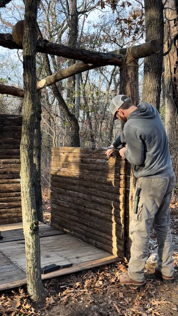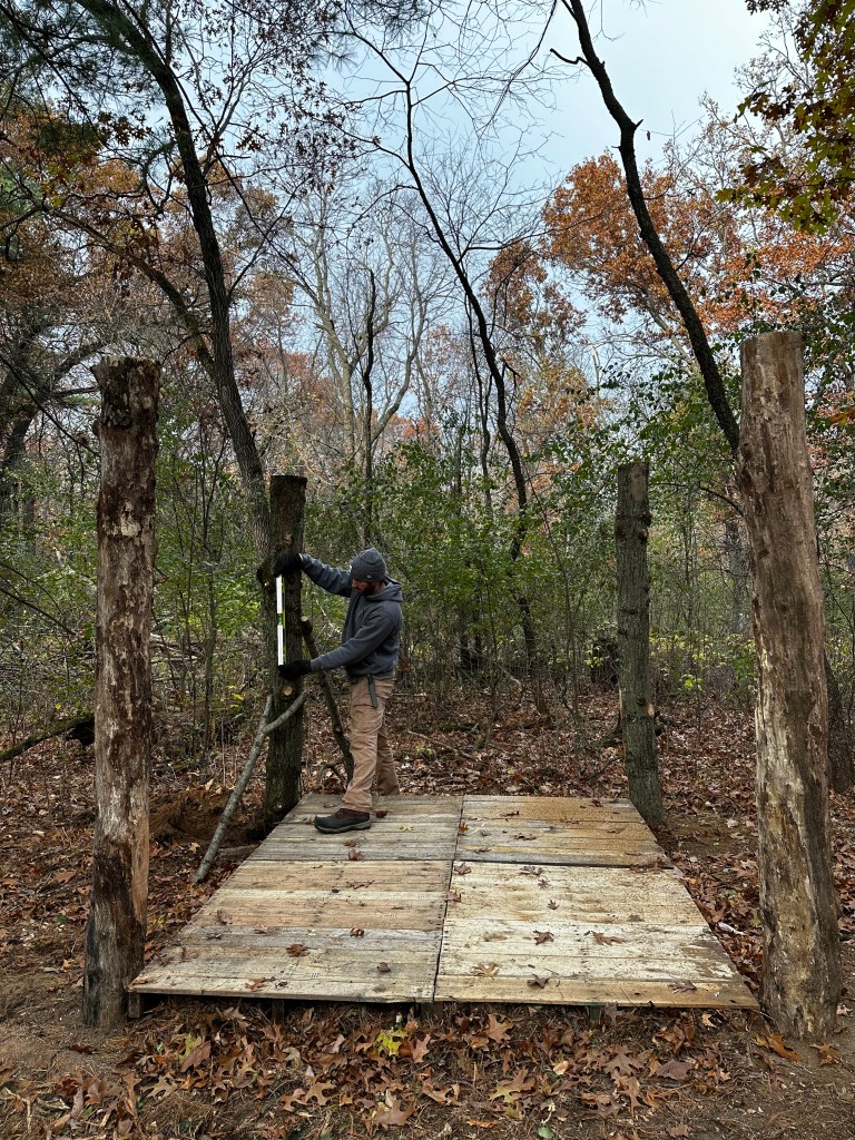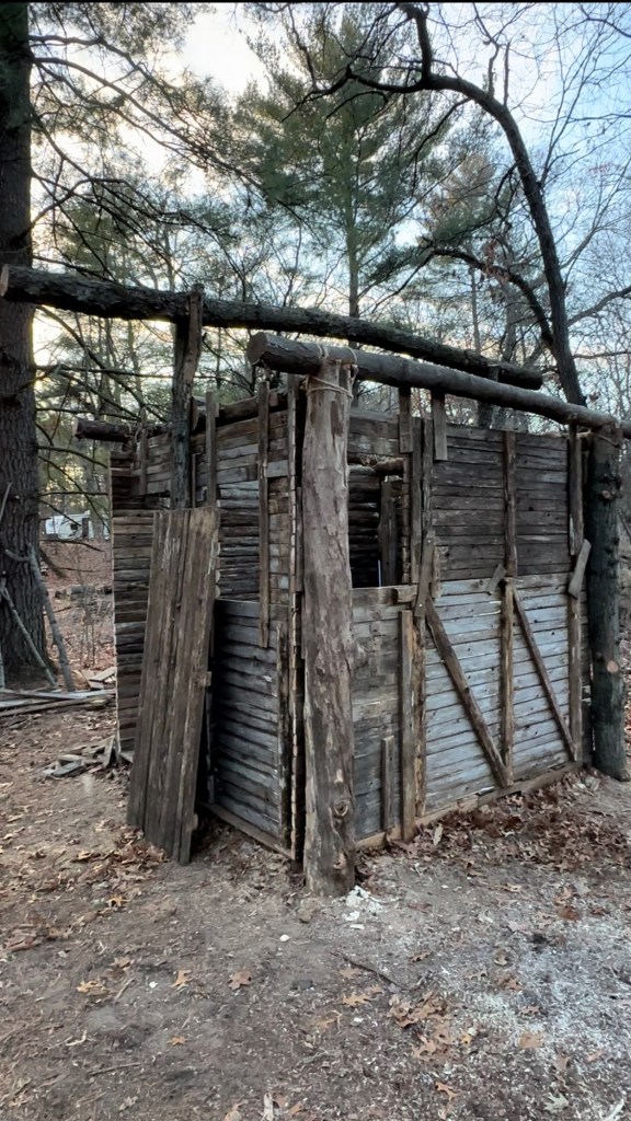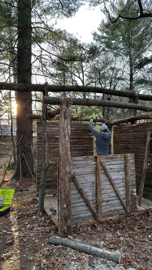 The structure is comprised of two walls – an interior wall and an exterior wall. Both walls were built using sections and individual posts from camp’s old cedar fence that had recently been replaced. Erik framed the interior by affixing the fence sections to all 6 supporting logs with nails and to the floor using corner braces.