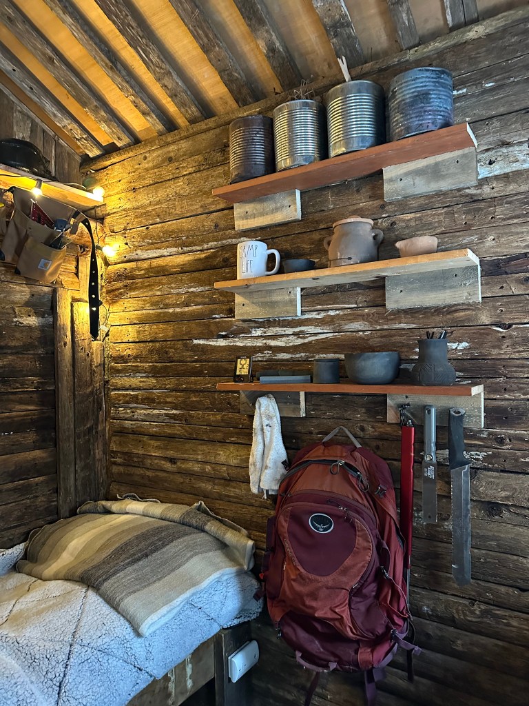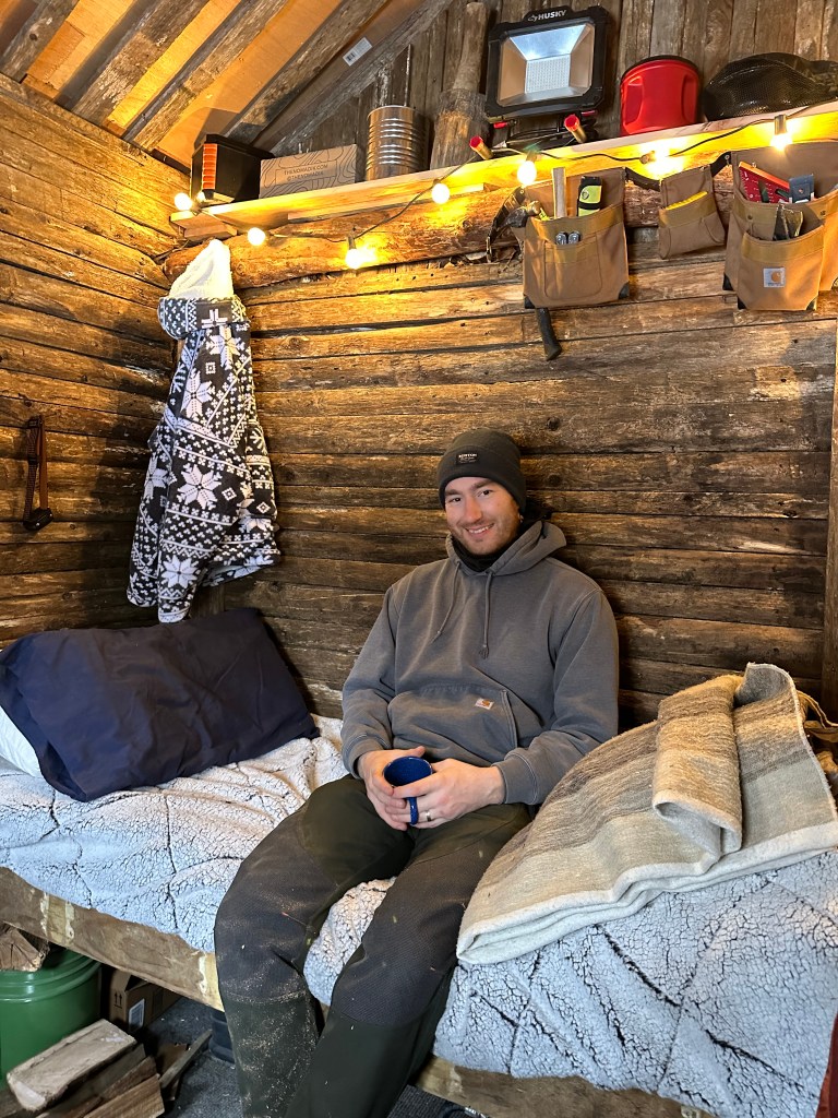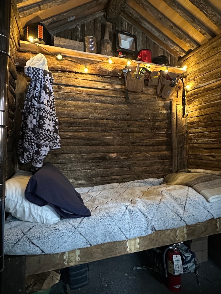 Inside, Erik constructed a bed frame from various pieces of extra wood we had around camp; the bed spans the entire back wall of the cabin. He also made a built-in table and lots of shelves for storage space. The only thing in the cabin that was purchased is the wood stove that’s a pretty necessary feature for keeping the cabin warm and cozy! Erik slept overnight in the cabin once last December, and based on his experience, is going to do a little more insulating to ensure comfort in future stays.