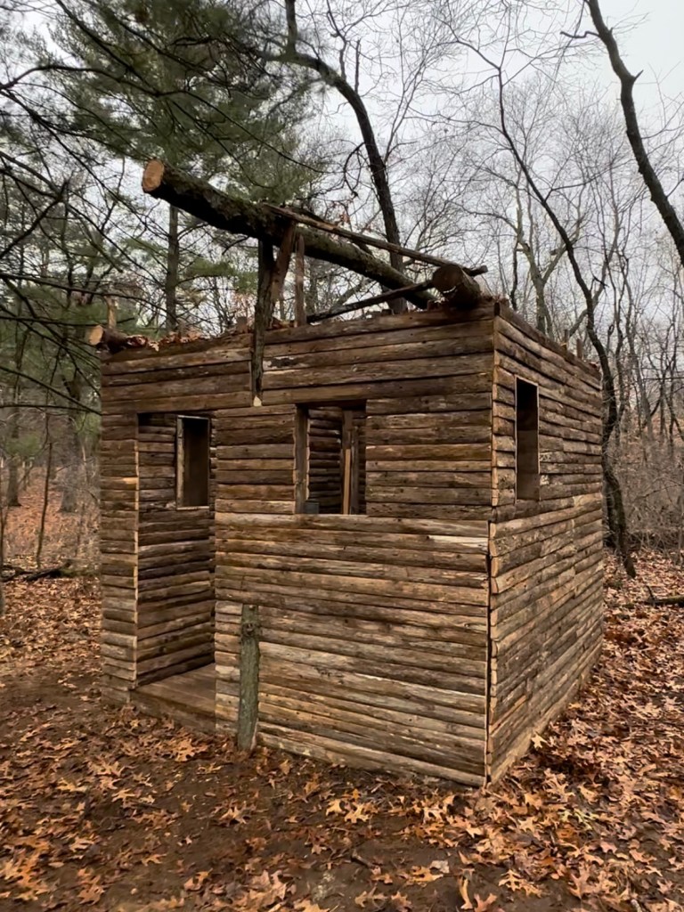 This past fall and winter, my husband Erik and I (well, he did most of the work…) built a bushcraft-style cabin in the backwoods using only recycled and repurposed materials. The idea originated from a desire to do something with a bunch of pallets and an old cedar fence that we had sitting around, and the cabin plan evolved from there. I had no idea when Erik started nailing pallets together what he was ultimately going to construct, but it became a really fun hobby project to work on in the evenings and weekends during a slower time of the year.