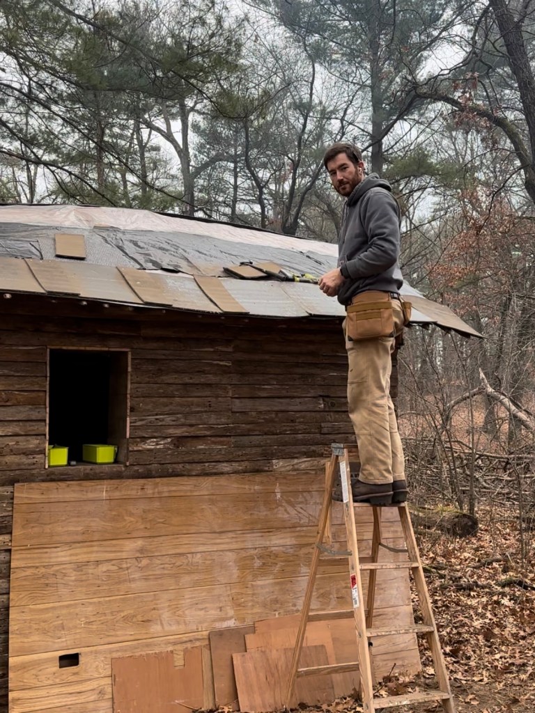 Next up was the roof, and Erik used more of the old fence posts for the rafters. Last spring, we had renovated one of the cabins at camp that used to have old 70s-style wood paneling – which Erik repurposed as roof sheathing! On top of that he placed old tarp pieces, and for the shingles he used the squares of carpet that had also been taken out of the camp cabins. Turned upside down with the rubber backing facing outward, the carpet square roof shingles are really water resistant.