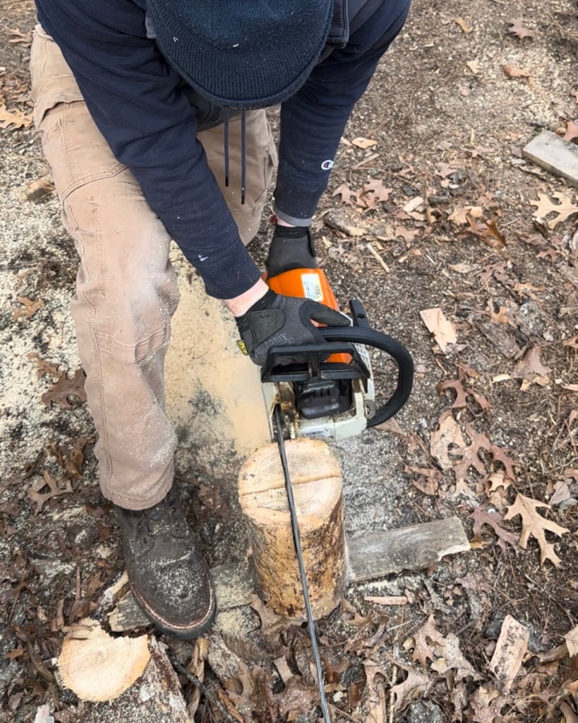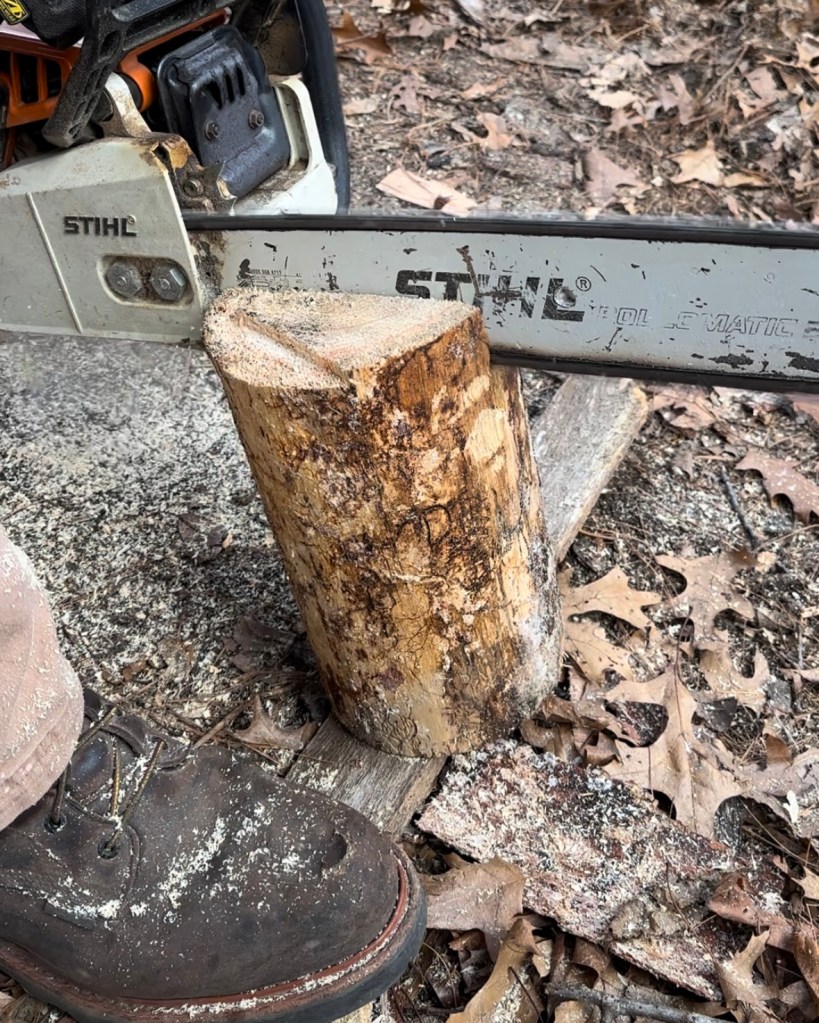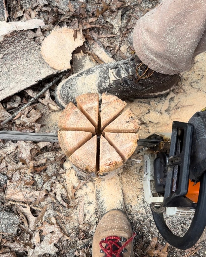 Because softwood burns more easily than hardwood, we used a fallen pine tree to make our first Swedish torch. Erik used a chainsaw to cut vertical slits into the log as you would section a pie; the cuts should go about ¾ of the way down.