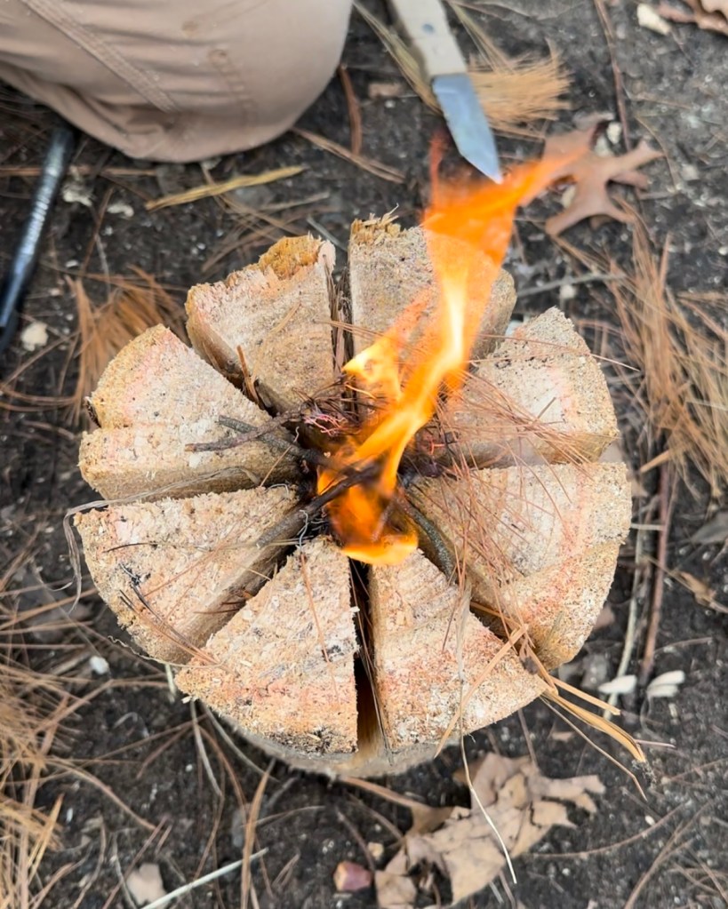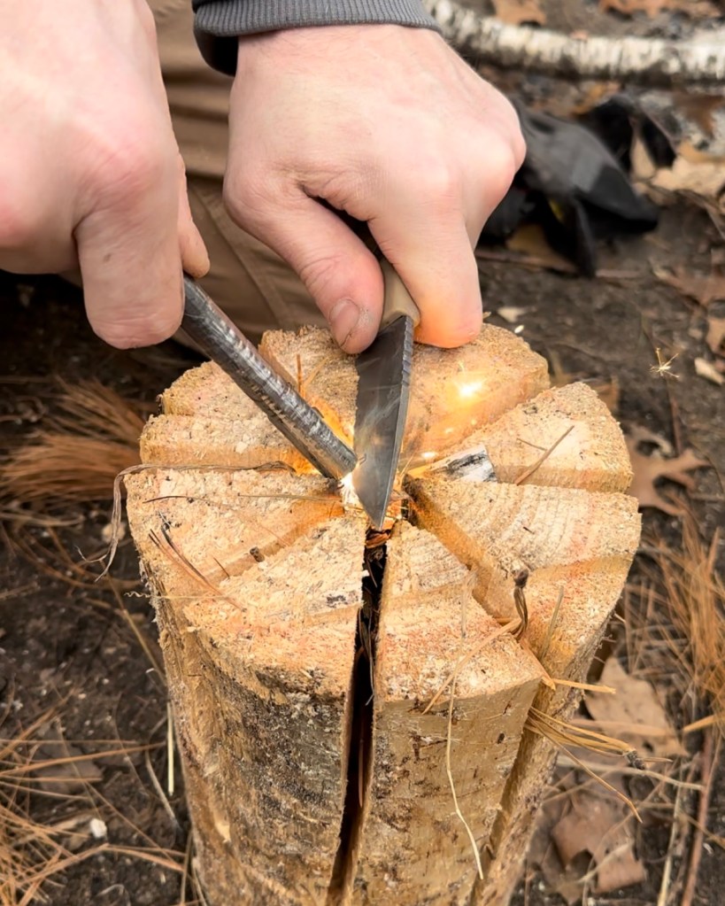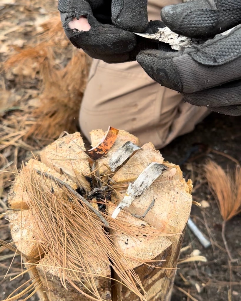 Then, we placed pieces of birch bark (a great fire starter!) on the top of the log, right in the center of the six cuts. Erik used a ferro rod to start the fire, but you can use matches or a lighter – the method doesn’t particularly matter unless you’re working on specific fire starting skills!