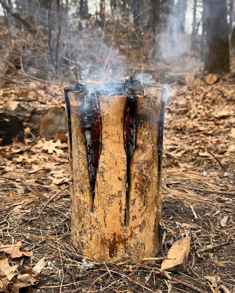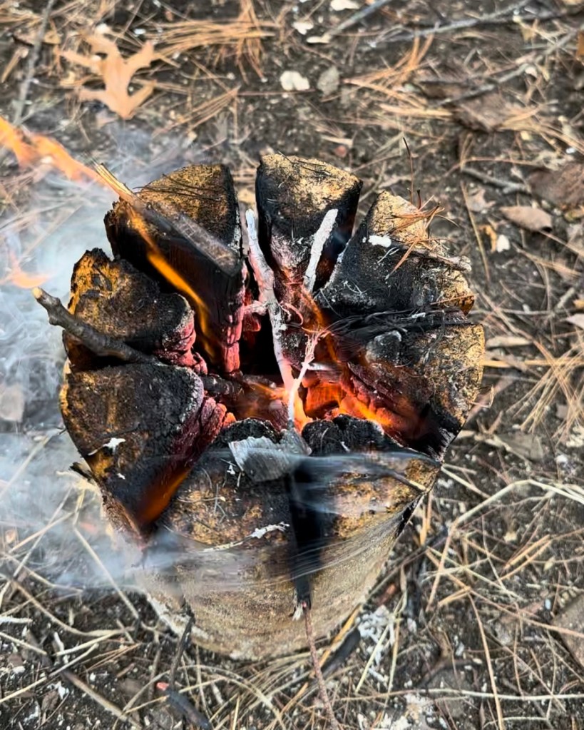 Everything was really wet from a recent rain, so we had to tend to the initial fire a bit more than we would have liked. But eventually, by adding dry oak pieces, it got going so we were able to let it burn by itself. The way a Swedish fire torch works is that the vertical slits allow air to feed the fire via the chimney effect. Then, as the fire burns at the top and embers drop down in the middle, the log is essentially burning itself from the inside out. Our Swedish torch burned for about an hour, but there are probably ways to extend this – such as using a wider log.